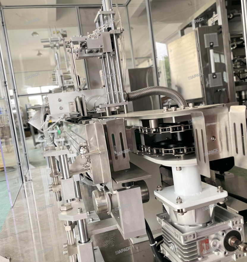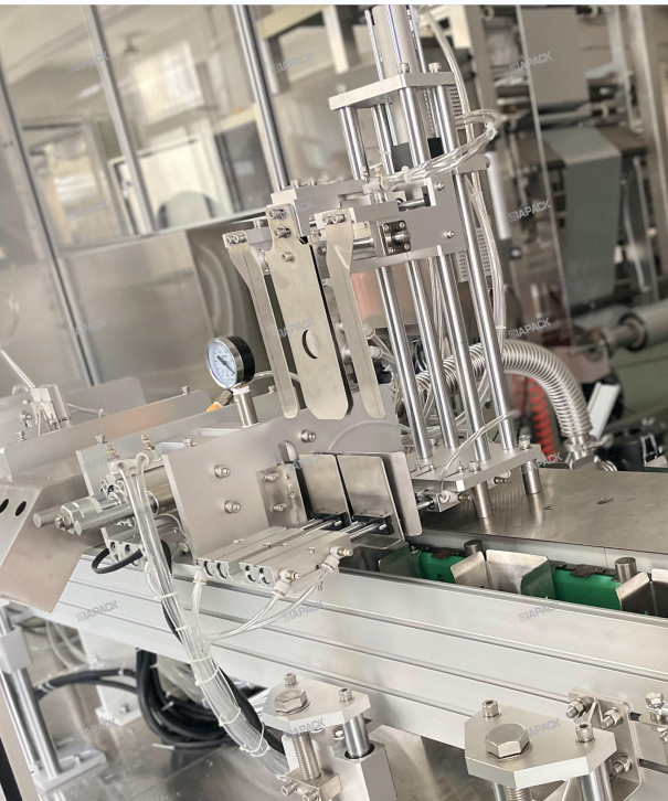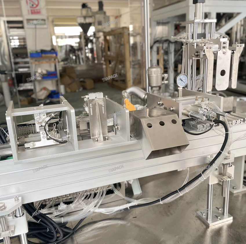 Tämä kone on suunniteltu erityinen kulmapussin valmistukseen, jossa on ylämerkinnät. Kun täysi pussi ja tuote pudotetaan tähän koneeseen. Tämä kone kantaa pussin, käy läpi pussin suun taittamisen kerran ja kiinnittää sitten etiketin. Koneen runko on valmistanut Siemens-tuotemerkin SUS304 .PLC ja kosketusnäyttö ottavat käyttöön. Ja pneumaattiset osat ottavat käyttöön SMC-brändin. Tärkeimmät sähkökomponentit ottavat käyttöön Omronin ja Schneiderin tuotemerkin. Tämä kone toimii automaattisen pakkauskoneen kanssa saavuttaakseen valmiin pussin kannen etiketin. Tämä kone voi saavuttaa toiminnon automaattisesti tarran erotettu ,Tarran lähetys .Etiketin tunnistin ja etiketin painaminen .