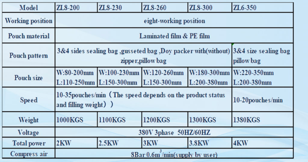 - Täysautomaattinen ajoittainen pyörivä esivalmistettujen pussien annostelu-, avaamis- ja sulkemiskone yhdistettynä automaattiseen kierukkajauheen täyttölaitteeseen, bulkkiruuvisyöttimeen ja tuotteen irtotavarasäiliöön